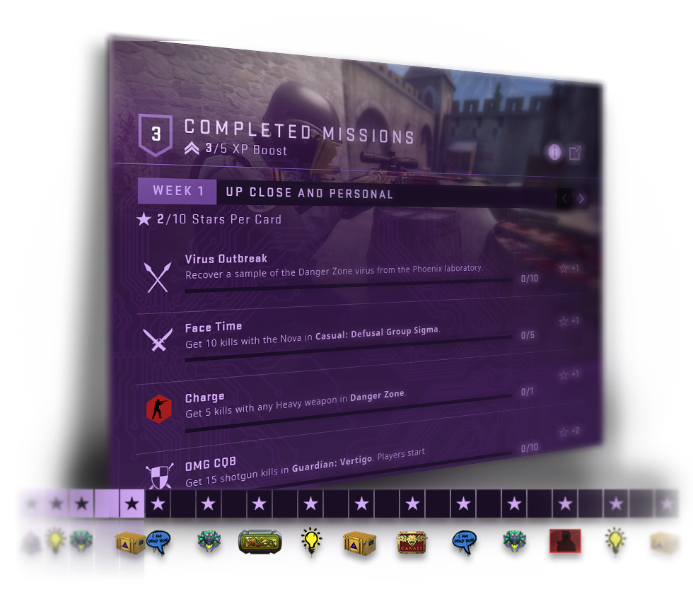 Her hafta birbiriyle çakışmayan ve istediğin sırada tamamlayabileceğin 6 görevi içeren yeni bir görev kartı alacaksın. Basit Eğlence, Rekabetçi, Tehlikeli Bölge, Muhafız ve diğer birçok oyun modunda görevleri tamamlayarak yıldız kazan!